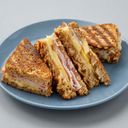 A savory grilled sandwich featuring smoked ham, cheddar, and havarti cheese, offering a rich, melty, and smoky flavor (For ref only)