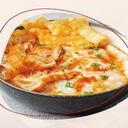 Bubur dengan toping cakwe+pangsit goreng+ayam+telur ayam setengah mateng