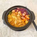 Spicy and flavorful broth poured on top of noodles, vegetables, meat and meatballs (For ref only)