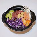 Chewy, savory, sweet and spicy Korean noodle soup comes along with seafood, vegetables and meatball (For ref only)