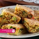 Stuffed savory pancake filled with eggs, vegetables, and spices, often served with dipping sauce. (For ref only)