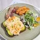 Creamy avocado paired with fluffy scrambled eggs, creating a deliciously satisfying breakfast dish. (For ref only)