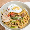 Crispy yellow noodles stir-fried with tender beef and vibrant vegetables in savory sauce. (For ref only)