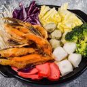 Spicy and flavorful broth poured on top of noodle, vegetables, lobster and meatballs (For ref only)