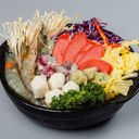 Spicy and flavorful broth poured on top of noodle, vegetables, seafood and meatballs (For ref only)