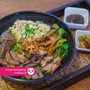 A flavorful noodle soup with herbs, spices, and crispy elements, served in a rich broth. (For ref only)