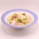 A hearty noodle soup with a rich pork-based broth, seafood, and mixed vegetables (For ref only)