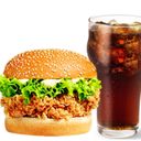 A breaded, fried chicken patty topped with spicy sauce and lettuce served on a toasted bun