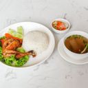 Fried chicken that is crispy skin and the meat is tender and juicy perfectly served with rice