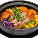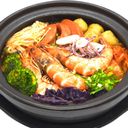 Chewy, savory, sweet, and spicy Korean noodle soup comes along with seafood, vegetable, and meatball (For ref only)