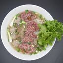 Savoury liquid poured on top of rice stick noodle, vegetables, beef and meatball (For ref only)