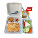 Steamed new rice, fried barbonymus schwanenfeldii , pickled yellow cabbage, pickled bok choy, free iced tea