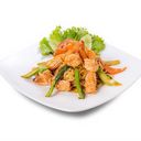 The salty and spicy chicken is stir-fried and coated with yellow lemongrass paste and peanut