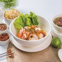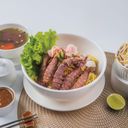 A flavorful soup served with rice stick noodles and braised pork garnished with herbs (For ref only)