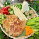 Fresh beef minced garlic red onion dried chili flake toasted rice mint sawtooth coriander scallion and mixed vegetable