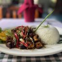Stir-fried meat with long chili, hot chili, and hot basil, served with rice
