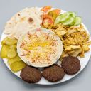 Hummus, falafel, vegan dumplings fried, olive, pickles, eggplant, tortilla on side. Garlic sauce, spicy sauce, on side.