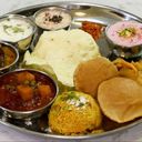 Indian vegetarian thali collection which includes different types of curries, dal, rice, roti, and desserts. Perfect for an Indian feast.