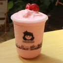 A sweet drink featuring strawberries, creamy texture, and a hint of coconut flavor. (For ref only)