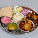 A colorful assortment of vegetarian dishes served with rice, bread, and accompaniments, offering a taste of diverse flavors
