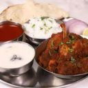 A rich assortment of mutton dishes served with rice, bread, and accompaniments, showcasing the flavors of traditional cuisine