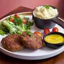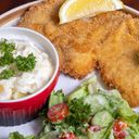 Breaded and pan-fried cutlet, golden and crispy on the outside, tender inside
