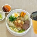Instant noodle soup with chicken feet egg and meatball which is slightly sour salty and sweet comes with one glass of luo han guo tea