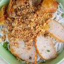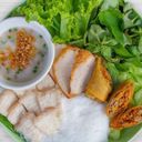 ម្ហូបវៀតណាមដែលមានបាញ់ហយ ហើយមានសាច់ ចៃយ៉ និងបន្លែនៅពីលើ