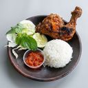 Nasi yang disajikan dengan ayam goreng renyah, biasanya dilengkapi dengan sambal dan lalapan
