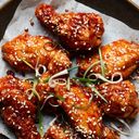 Crispy, spicy wings glazed in a sweet and savory sauce, garnished with sesame seeds. (For ref only)