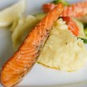 Salmon turned carrot broccoli mash potatoes with milk butter and salt pepper