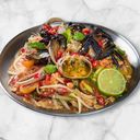 ផ្លែល្ហុងដែលមិនទាន់ទុំមានរសជាតិឆ្ងាញ់ត្រូវបានឈូស ហើយលាយជាមួយនឹងបន្លែចម្រុះពណ៌ និងជីជាច្រើនមុខ ដែលមានរសជាតិហិរ គ្រឿងផ្សំចុងក្រោយគឺបង្គាស្រស់ឆៅ