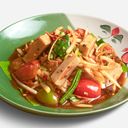 ល្ហុង ត្រីសាលម៉ុន និងបន្លែលាយជាមួយគ្រឿងផ្សំពិសេសដែលមានរសជាតិប្រៃ ផ្អែម