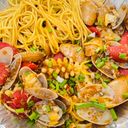 Sautéed clams with vibrant vegetables, garlic, and soy sauce. (For ref only)