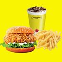 Spicy chicken patty topped with fresh ingredients, served with crispy fries and a soda. (For ref only)