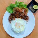សាច់គោឆាសាមញ្ញតែមានរសជាតិឆ្ងាញ់ដែលមកជាមួយបន្លែនិងបាយ
