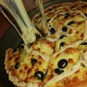 A thick-crust pizza in a dark pan, with a slice being pulled away, creating a long, gooey cheese stretch.