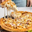 A pizza in a white box, topped with browned mozzarella cheese, chunks of seasoned chicken, sliced jalapeños, and strips of red and green peppers.