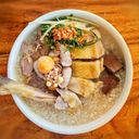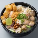 A comforting bowl of fish porridge paired with flavorful beef fried noodles (For ref only)