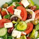 "Traditional Greek salad with tomatoes, cucumbers, green bell peppers , red onion, olives and feta cheese dressed with olive oil and herbs."