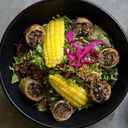 សាឡាដស្រស់ជាមួយល្ពៅដុត ប៉េងប៉ោះ សណ្តែកបៃតង មើមយ៉េន ពោតផ្អែម ផ្កាខាត់ណាខៀវ ខ្ទឹមក្រហមជ្រក់ ត្រប់អាំងនិងស៊៊ូគីនីបម្រើជាមួយប្រេងល្ង ឬទឹកជ្រលក់ប្រេងអូលីវ