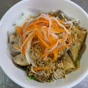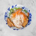 ម្ហូបវៀតណាមដែលមានបាញ់ហយ ហើយមានសាច់ ចៃយ៉ និងបន្លែនៅពីលើ