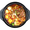 Savory duck blood stew paired with sweet, citrusy soda for a unique flavor experience. (For ref only)
