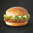 សាច់មាន់អត់ឆ្អឹងបំពងនិងត្រូវបានដាក់ចន្លោះនំប៉័ងបឺហ្គឺរអមដោយបន្ល ែស្រស់ៗ