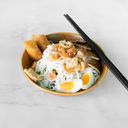 ម្ហូបវៀតណាមដែលមានបាញ់ហយ ហើយមានសាច់ ចៃយ៉ និងបន្លែនៅពីលើ