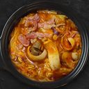 នំភីហ្សាទន់ជាមួយបន្លែជាច្រើនមុខ បូករួមទាំងទឹកជ្រលក់សាច់ក្ដាមដ៏ឈ្ងុយឆ្ងាញ់នៅពីលើ