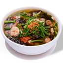 ទឹកស៊ុបមានរសជាតិឆ្ងាញ់ចាក់លើគុយទាវ បន្លែ និងប្រហិតសាច់គោ