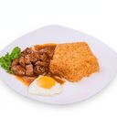 បាយសត្រូវបានយកមកឆាជាមួយស៊ុត បន្លែ និងសាច់ ហើយមកជាមួយសាច់ចៀនដែលមានរសជាតិឈ្ងុយឆ្ងាញ់
