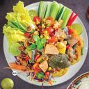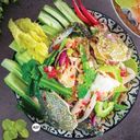ត្រីសាលម៉ុនស្រស់ជាមួយល្ហុង ប៉េងប៉ោះ សណ្ដែកគួរ ហៃប៊ី និងក្តាម រសជាតិជូរ ប្រៃ ហឹរ ឆ្ងាញ់
