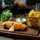 Crispy battered fish served with golden fries and tartar sauce, a classic British meal. (For ref only)
